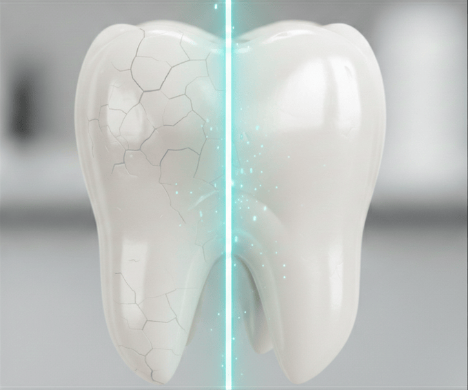 - Deep Structural Repair Fills in the microscopic cracks and early cavities by rebuilding lost enamel.